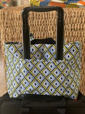 内ポケットにはパスポート、外ポケットに18cm幅のスーツケースのハンドルが通ります。文庫本も入ります。